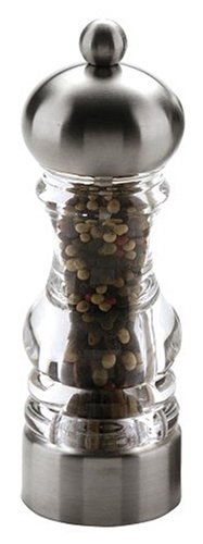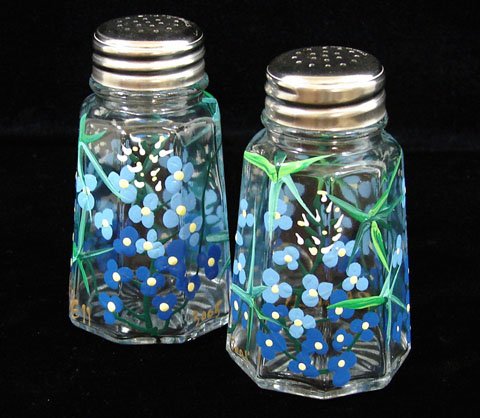 - Slim, textured-glass salt and pepper shakers in metal stand; completely food-safe